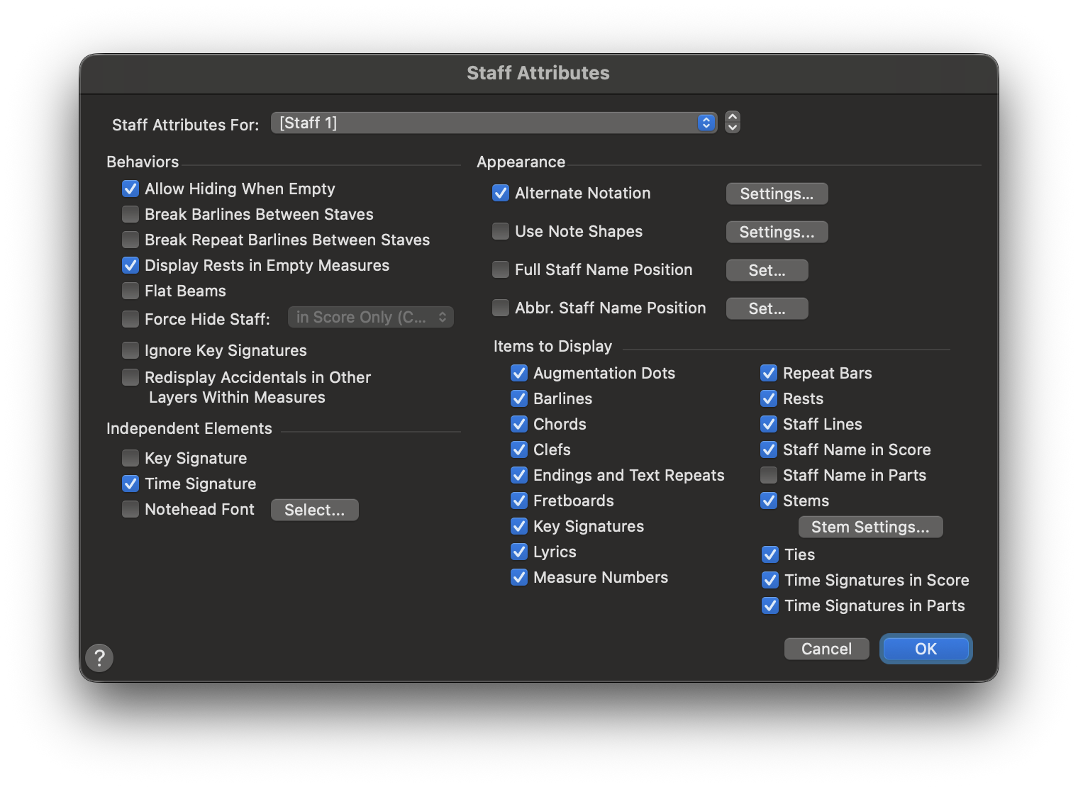 - Staff Attributes:譜表屬性 用來控制「單一譜表 要顯示哪些元素、如何顯示」